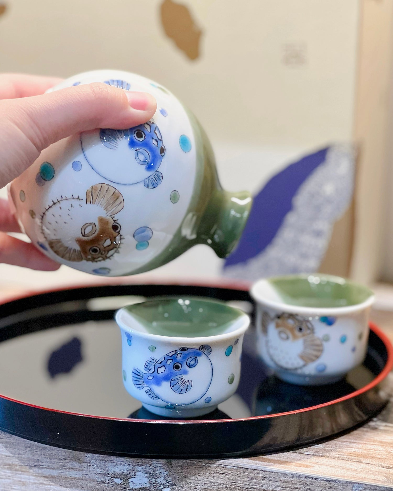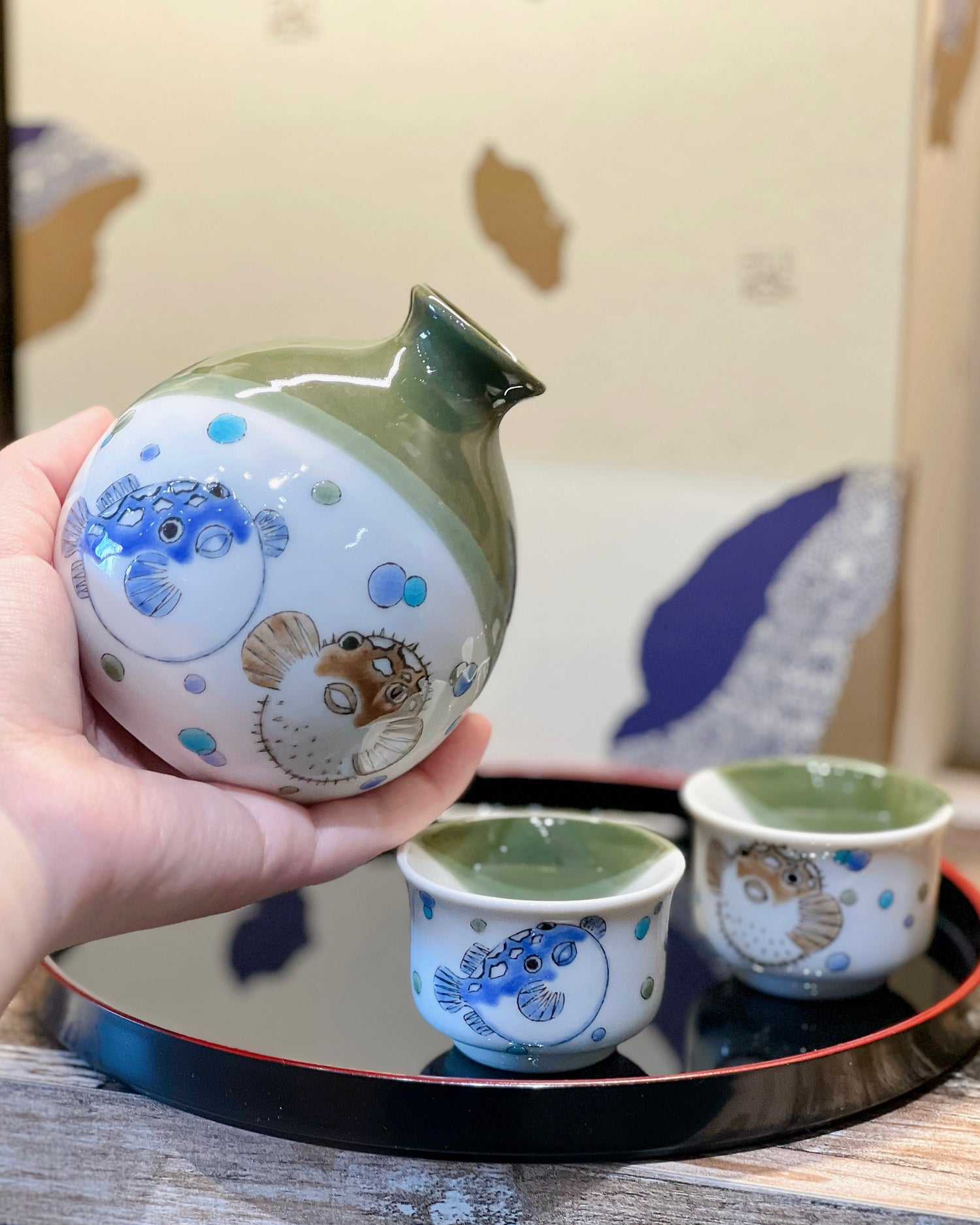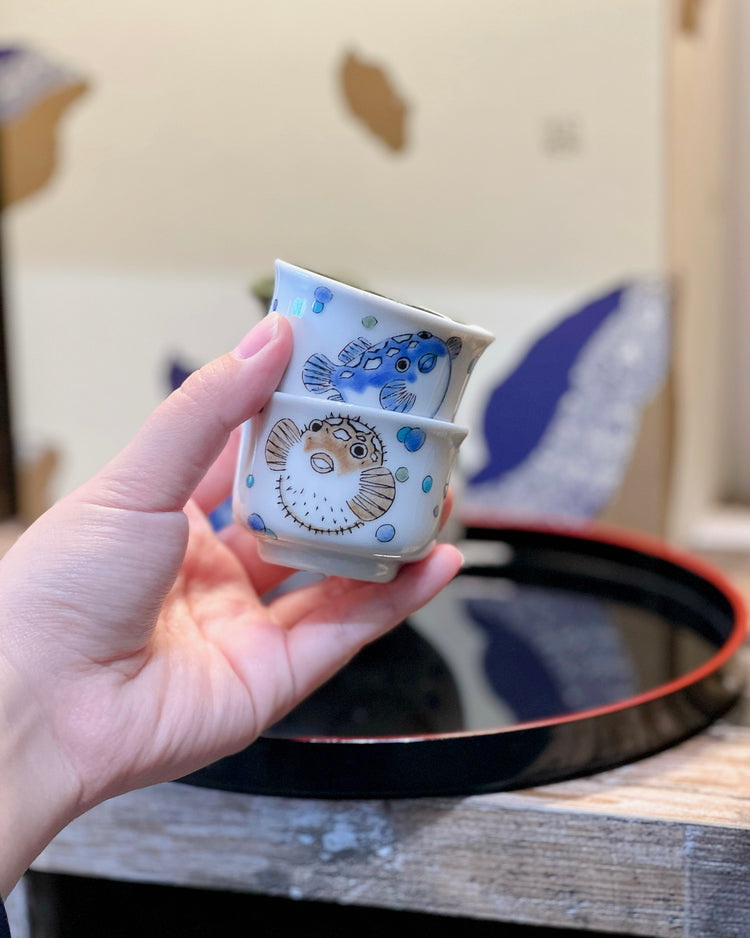 Kutani ware Puffer Fish Sake set(With Tray Gift Box)