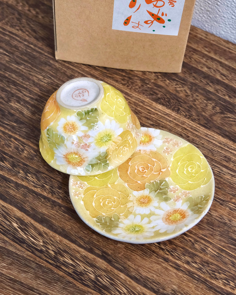 Yuzuriha Flower tea cup and saucer set黄彩色絵花(Gift Box)
